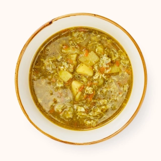 Шпинат, картофель, лук репчатый, морковь, маргарин, яйцо куриное, перец черный молотый, лавровый лист, соль.